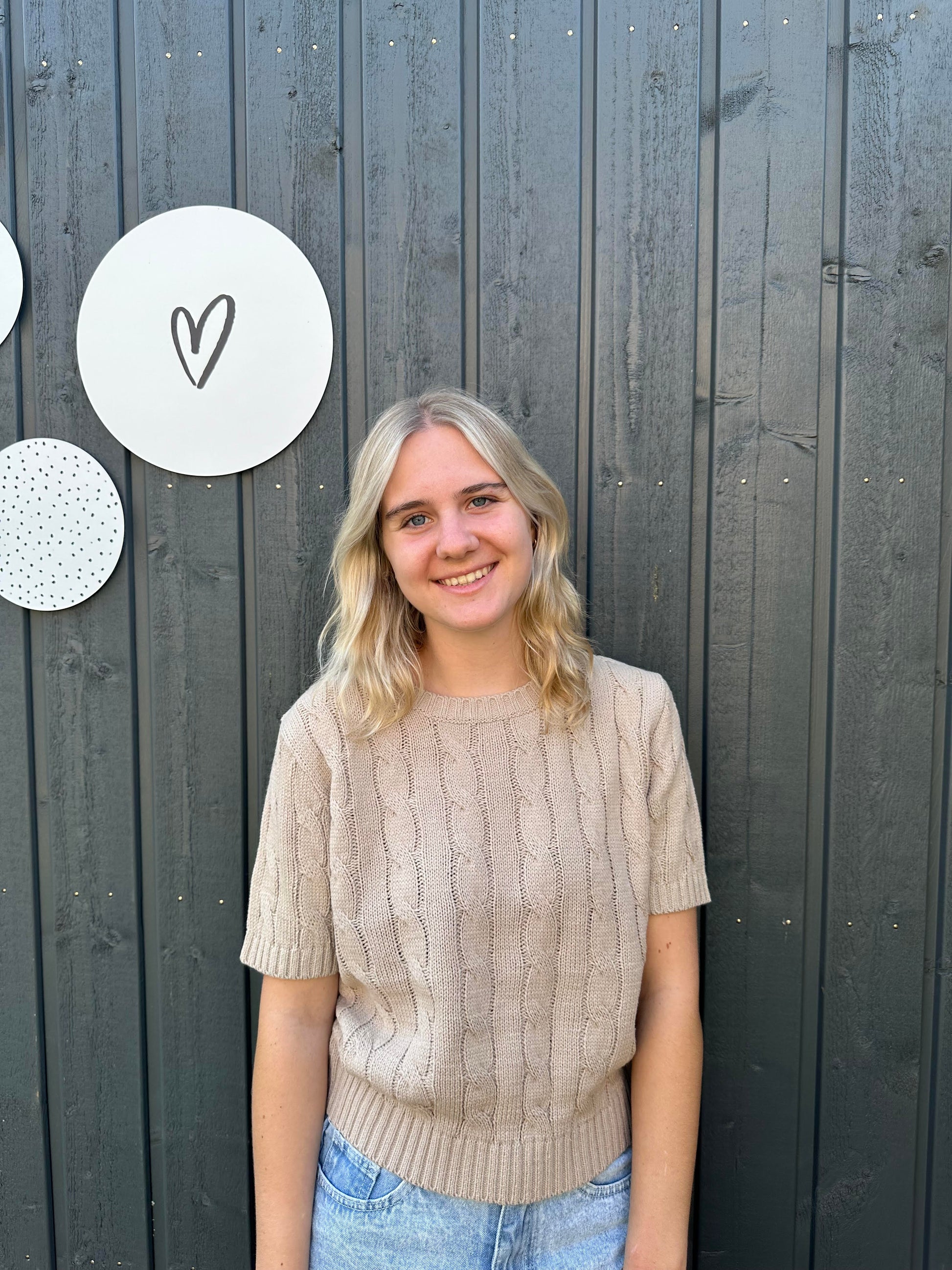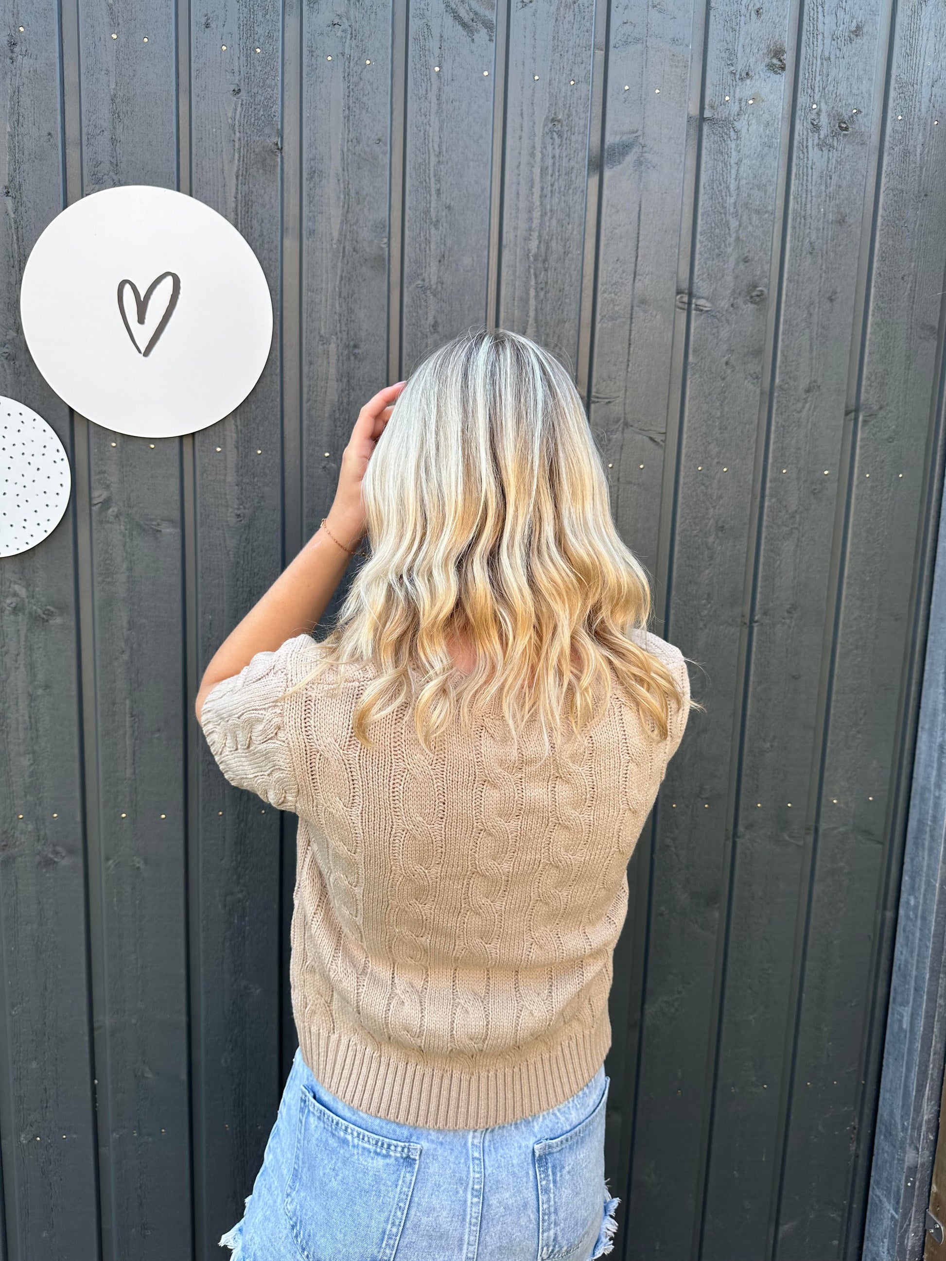 Deze klassieke gebreide trui met kabels en korte mouwen en heeft een gezellige uitstraling.