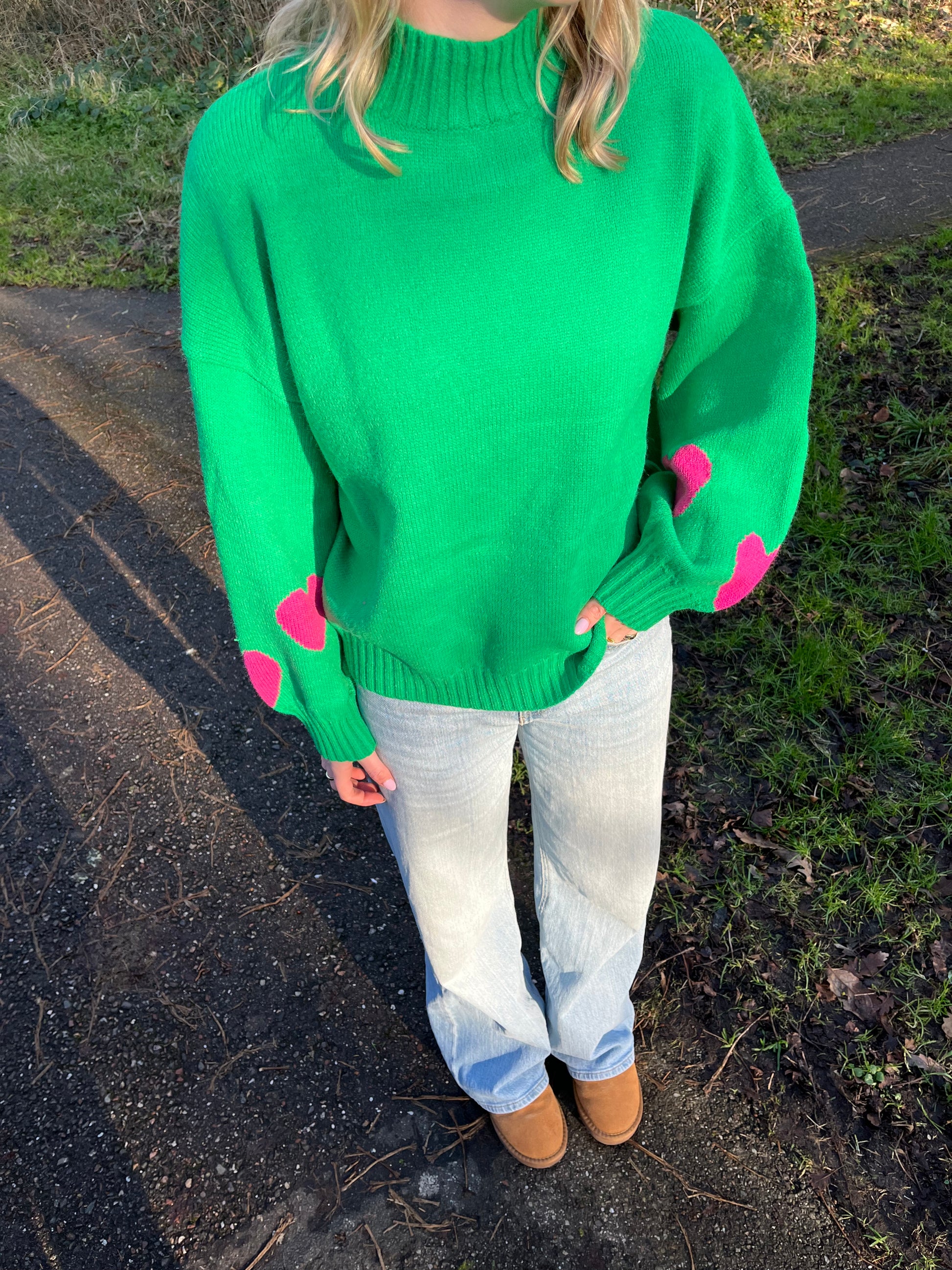 Deze groene trui met roze hartjes is gemaakt van 45% acryl, 30% polyester en 25% nylon