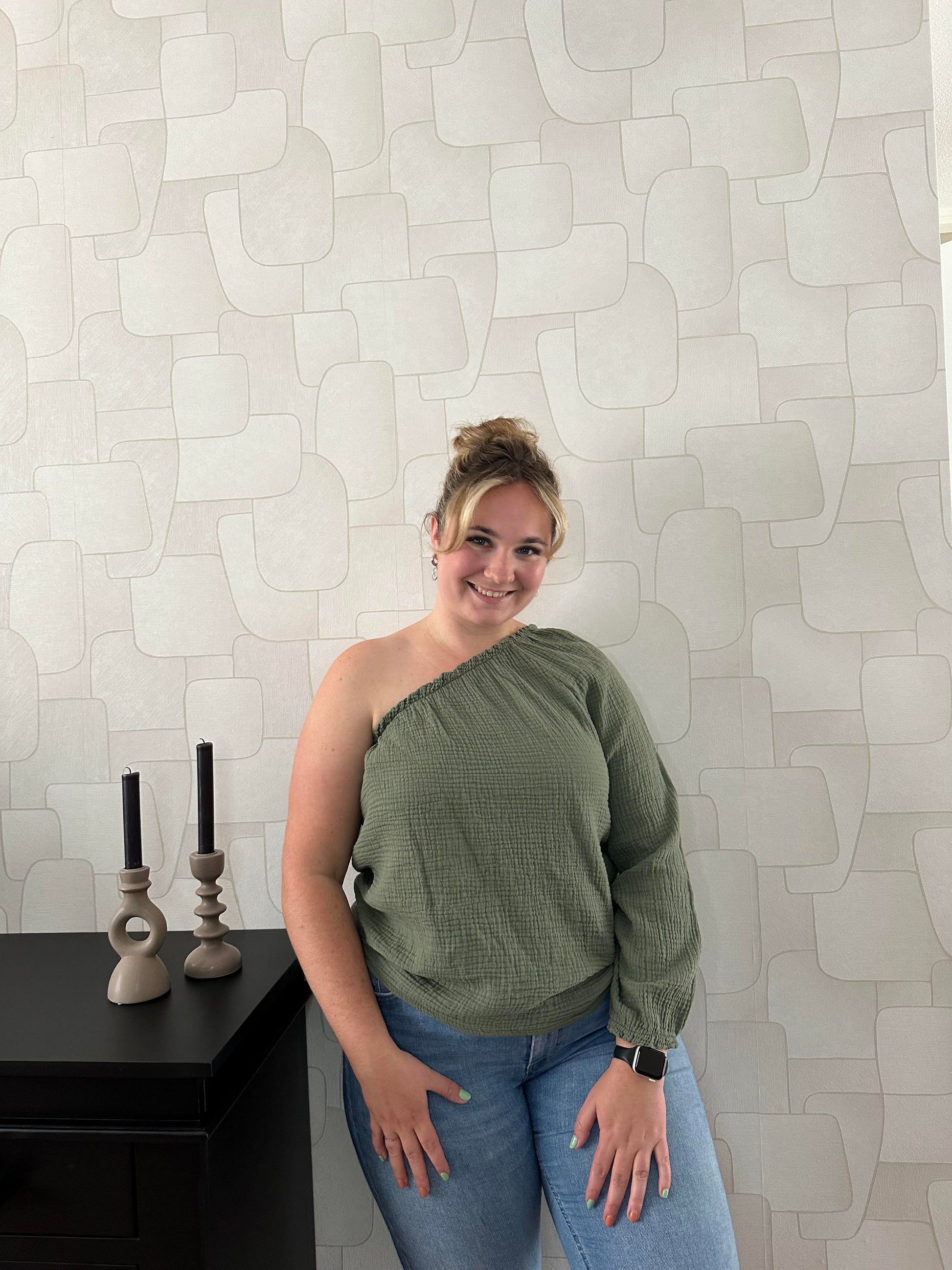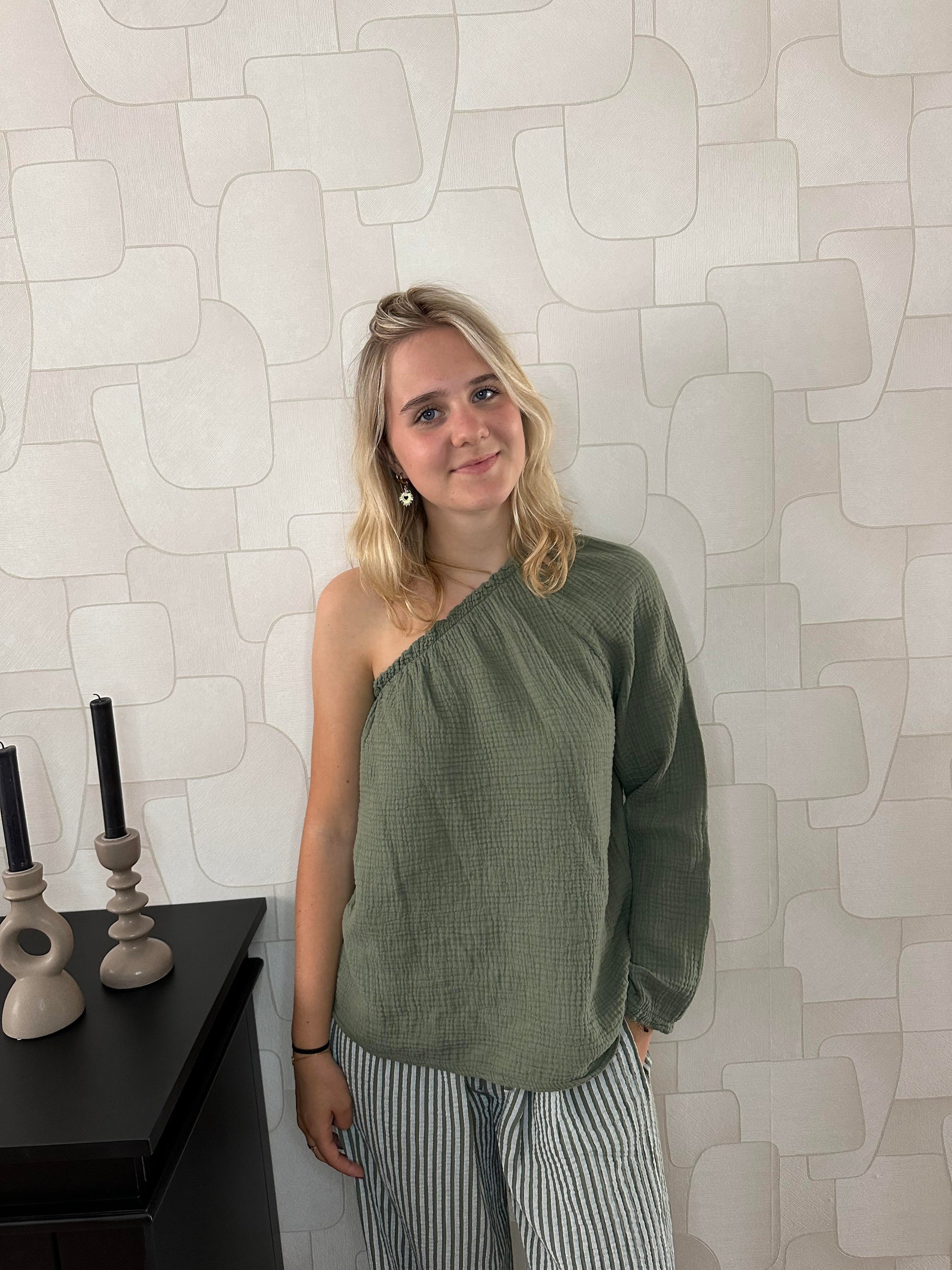 Deze basic maar toch stijlvolle one shoulder top is perfect voor zowel casual als chique gelegenheden. Verkrijgbaar in de mooie kleur Kaki.